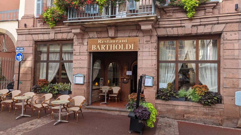 Wir waren kaum wieder an der Berta angekommen, begann es zu regnen, und wie! Alle Wanderer und sonstigen Personen, die jetzt noch draußen waren, wurden klitschenass. Wir hatten im Café am Parkplatz zwei Croissants gekauft, die aßen wir jetzt mit einer Tasse Kaffee. Danach fuhren wir im Regen die Route des Crêtes weiter in Richtung Cernay, bogen aber kurz vor der Stadt nach Colmar ab. Inzwischen hatte es aufgehört zu regnen, aber in Richtung Colmar sah es gar nicht gut aus. Was tun?