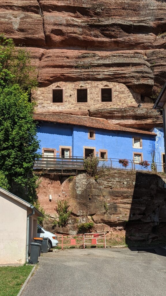 Auf kleinen Sträßchen machten wir uns auf den Weg gen Süden. Wir wollten die Felsenwohnungen in Graufthal besuchen. Da sich das Wetter wunderschön herausputzte, entschlossen wir uns, zuerst einen Stellplatz von France Passion in Dossenheim-sur-Zinsel anzufahren und von dort aus mit den Rädern zu den Felsenwohnungen zu fahren.