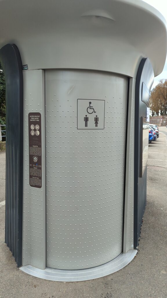 In Sélestat angekommen war es zumindest trocken. Was sich aber als schwierig herausstellte war das Finden eines Parkplatzes. Zweimal ist Udo durch die Innenstadt gefahren, bis wir dann endlich einen Parkplatz am Rand der Altstadt fanden. Er war zwar nicht umsonst, aber die 2 Euro taten uns nicht weh und der Platz überraschte uns zudem mit einem besonderen WC mit Selbstreinigung.