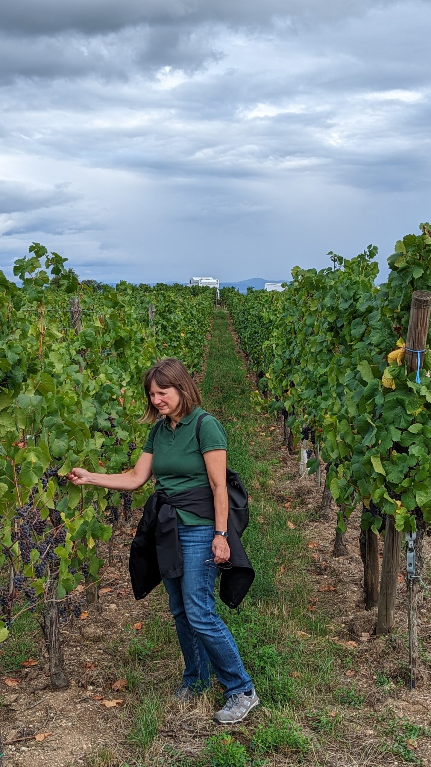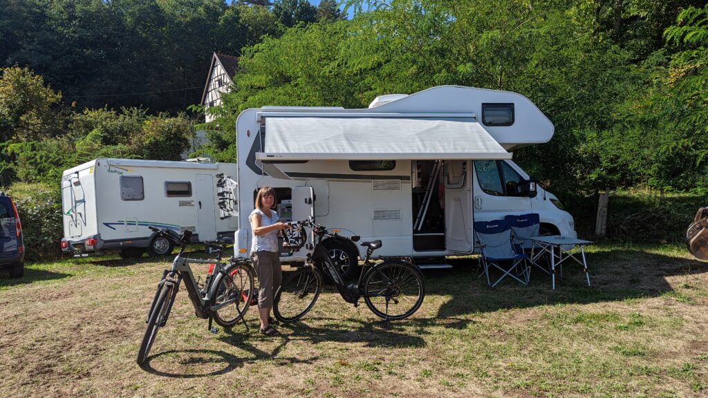 Wir beschlossen, nach Ribeauvillé weiterzufahren und dort auf den Campingplatz zu gehen, um ausgiebig duschen und die Bikes wieder laden zu können. Außerdem wollten wir gerne auf diesen Campingplatz, da es dort Störche geben soll, die zu den Menschen kommen. Daher war unsere Enttäuschung groß, als wir dort ankamen und erfuhren, dass der Platz komplett belegt war. Die freundliche Dame am Empfang empfahl uns einen Camperstellplatz im Ort, der ebenfalls Strom hat, aber auch dieser war komplett voll. Es blieb uns nichts weiter übrig als ins nächste Ort zu fahren. Der erste Parkplatz, den wir in Riquewihr anfuhren, war uneben, ohne Strom und dazu noch sehr teuer – 15 Euro bis am nächsten Vormittag um 9 Uhr. Darauf hatten wir nun wirklich keine Lust und so fuhren wir weiter zum Campingplatz des Ortes. An der Einfahrt stand wieder ein Schild: completed. Wieder nichts! Inzwischen bereuten wir es schon, unseren schönen Standplatz in den Weinbergen aufgegeben zu haben. Wir suchten in der Karte nach neuen Optionen, als plötzlich eine Frau an unser Fenster klopfte und fragte, ob wir einen Platz suchten? Es war die Dame vom Empfang und sie sagte, dass ihr gerade eine Reservierung storniert worden sei und wenn wir wollten, könnten wir den Platz haben. Natürlich wollten wir und kamen so doch noch zu Strom und einer schönen warmen Dusche. So nahm ein wunderschöner Tag noch ein gutes Ende.