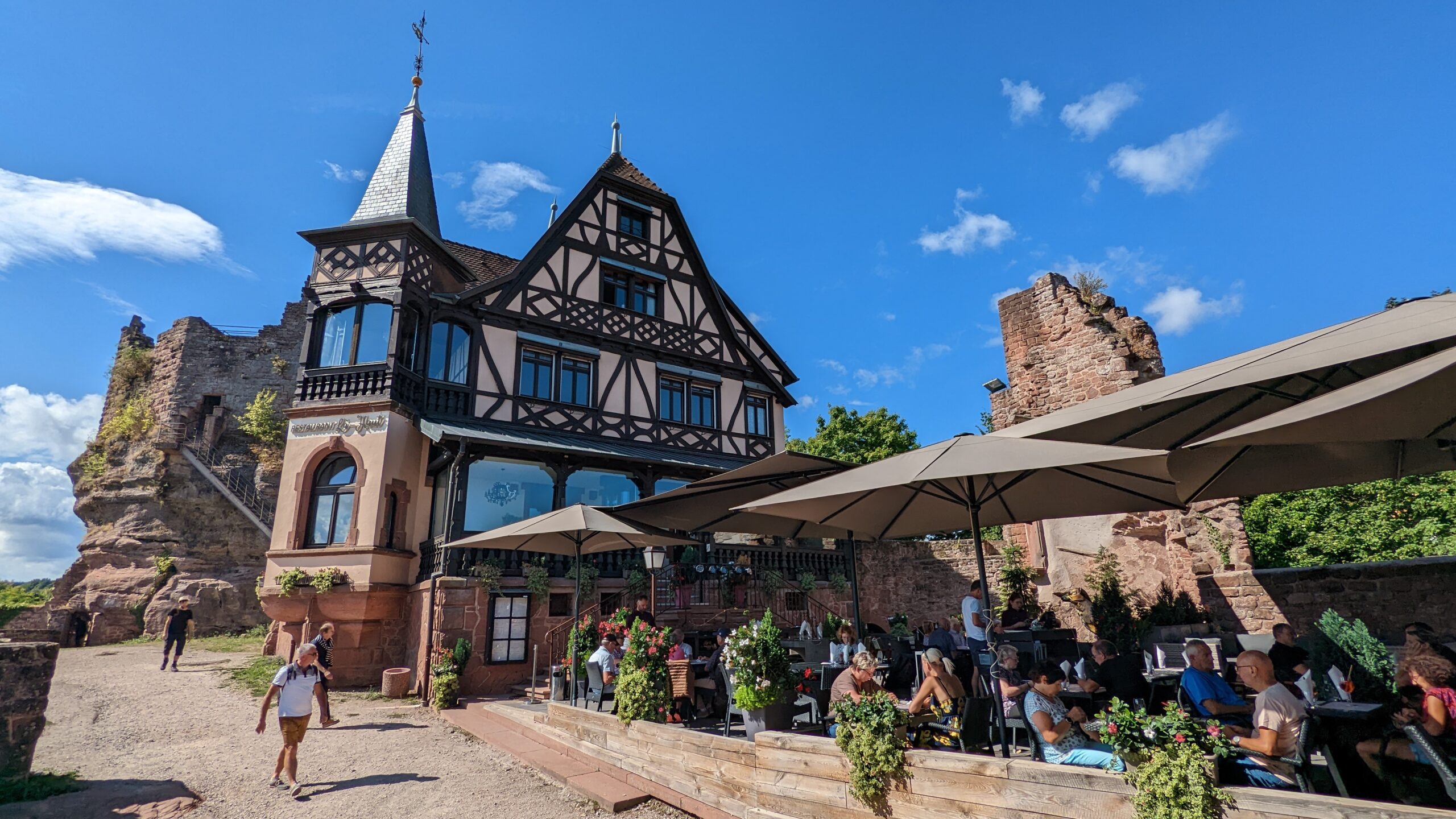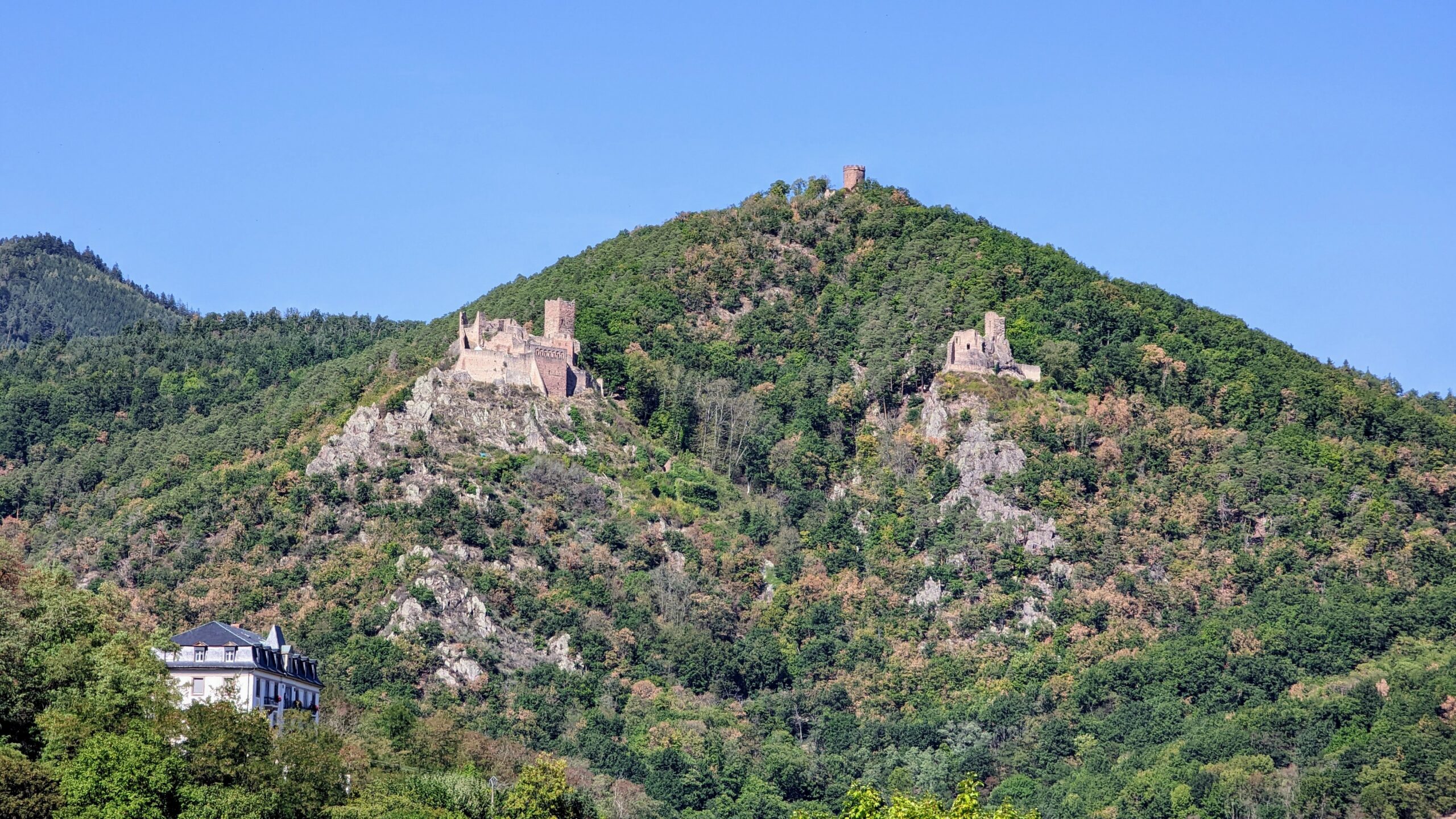In der Nacht hat es wieder geregnet, aber am Morgen begrüßten uns die Sonne und milde Temperaturen. Wir frühstückten vor dem Camper mit herrlichem Blick aufs Umland und unterhielten uns dann noch eine ganze Weile mit unseren Nachbarn, aus Cotbus. Sie waren mit einem Pössel und zwei kleinen Kindern auf Kletter- und Bolderurlaub. So kamen wir erst um 10:30 Uhr los. In Dossenheim fielen uns Wegzeiger zu einer Camperstation auf, denen wir folgten und tatsächlich vor einem Campingplatz eine frei zugängliche Dumpingstation fanden, wo wir unser Klo und Abwasser entsorgen und Frischwasser tanken konnten. So wieder gut ausgerüstet wollten wir als erstes den Tour Chappe, einen ersten mechanischen Telegrafenturm, besichtigen. Dort, wo wir ihn eigentlich vermuteten, fanden wir stattdessen eine wunderschöne Schlossruine, das Chateaux de Haut-Barr, mit herrlicher Aussicht und einem Restaurant im Burghof.