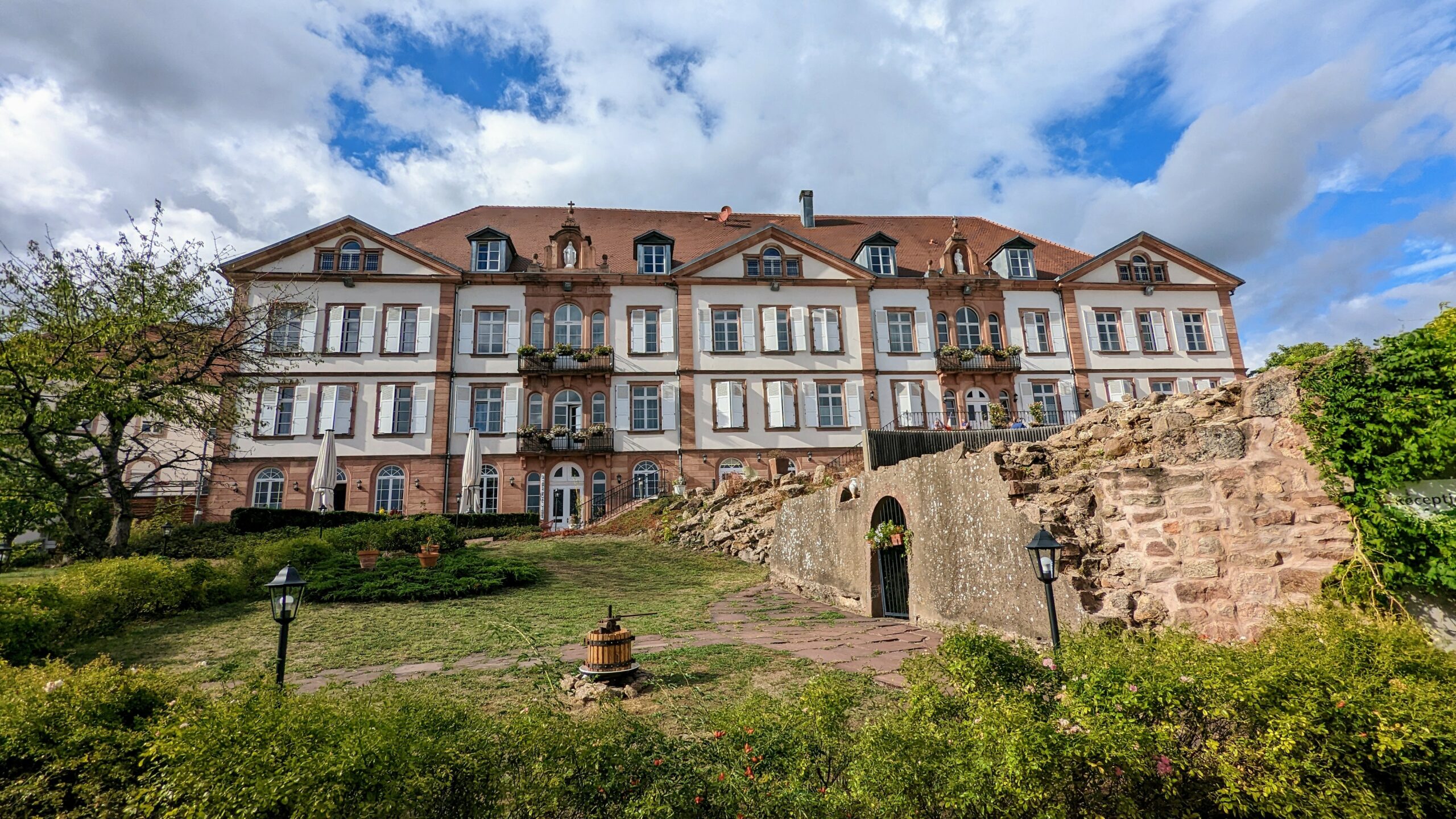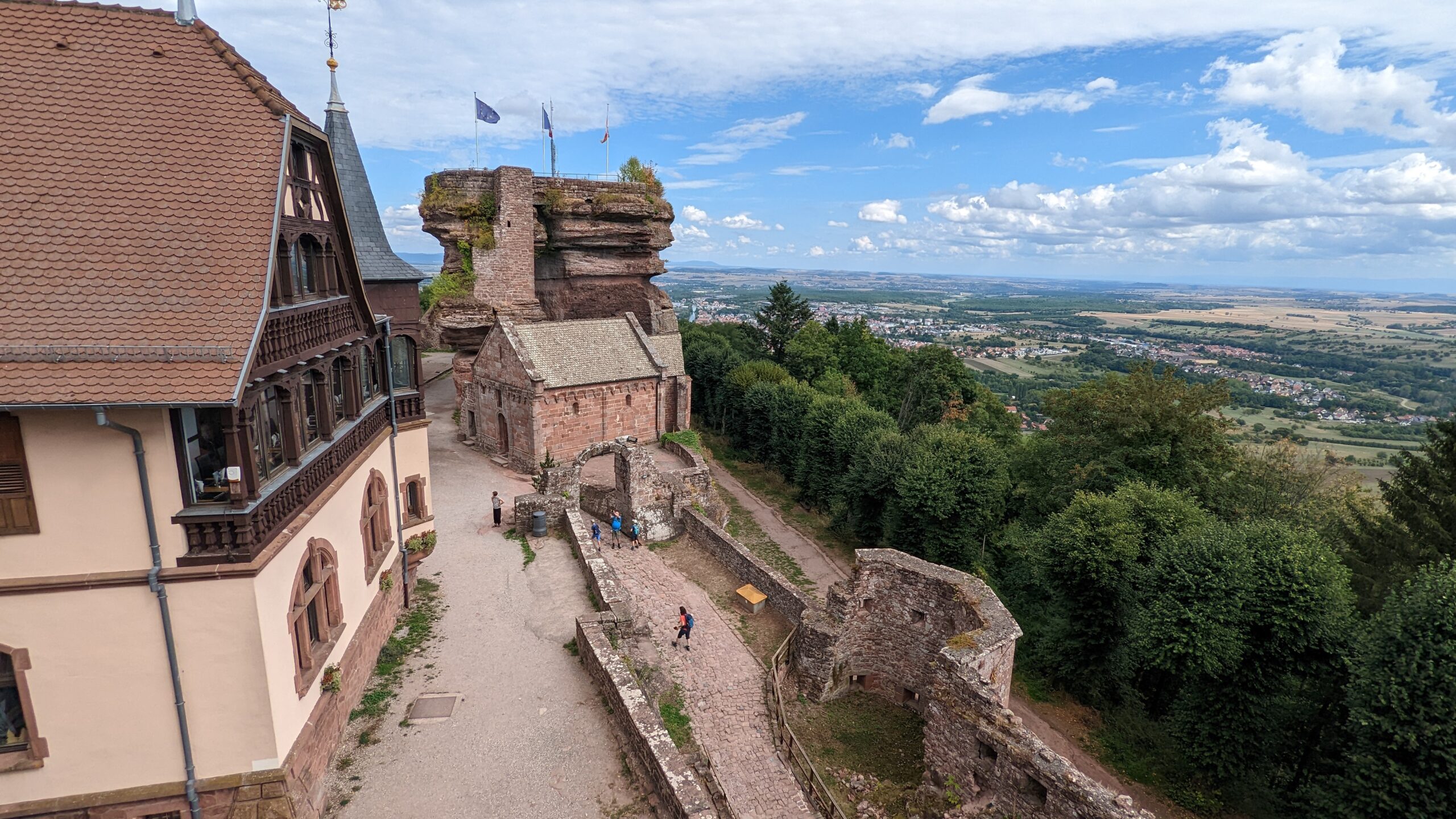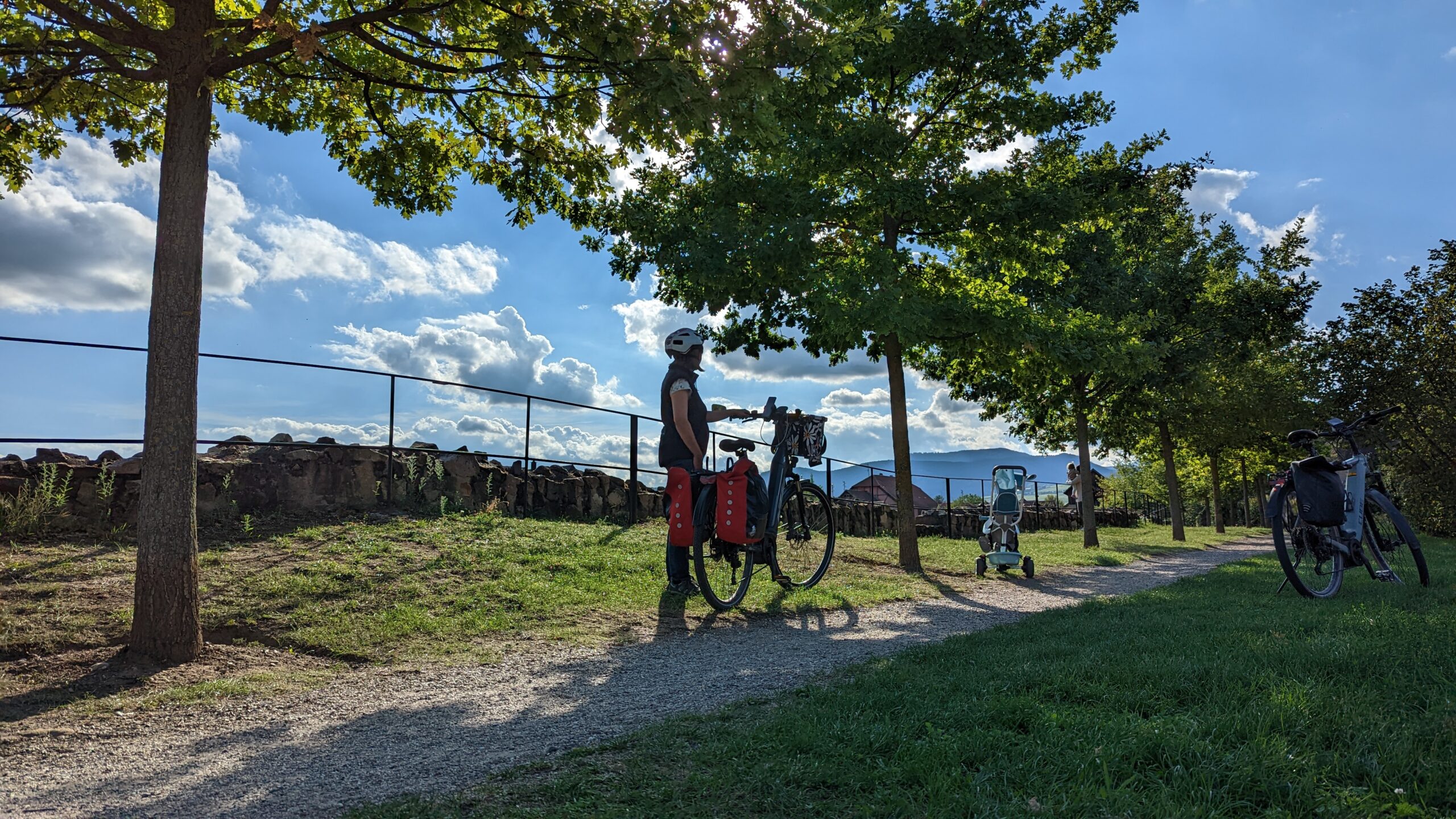 Wir bekamen einen Platz im Garten mit sehr schöner Aussicht, allerdings auch einer Baustelle vor dem Haus. Wir verzehrten unterwegs gekaufte Brezeln und süße Stückle, dann packten wir die Räder und starteten zu einer 55-km-Runde: zuerst zu den Felsenwohnungen, dann nach Saverne und über den Mont Saint Michel wieder zurück zur Berta.