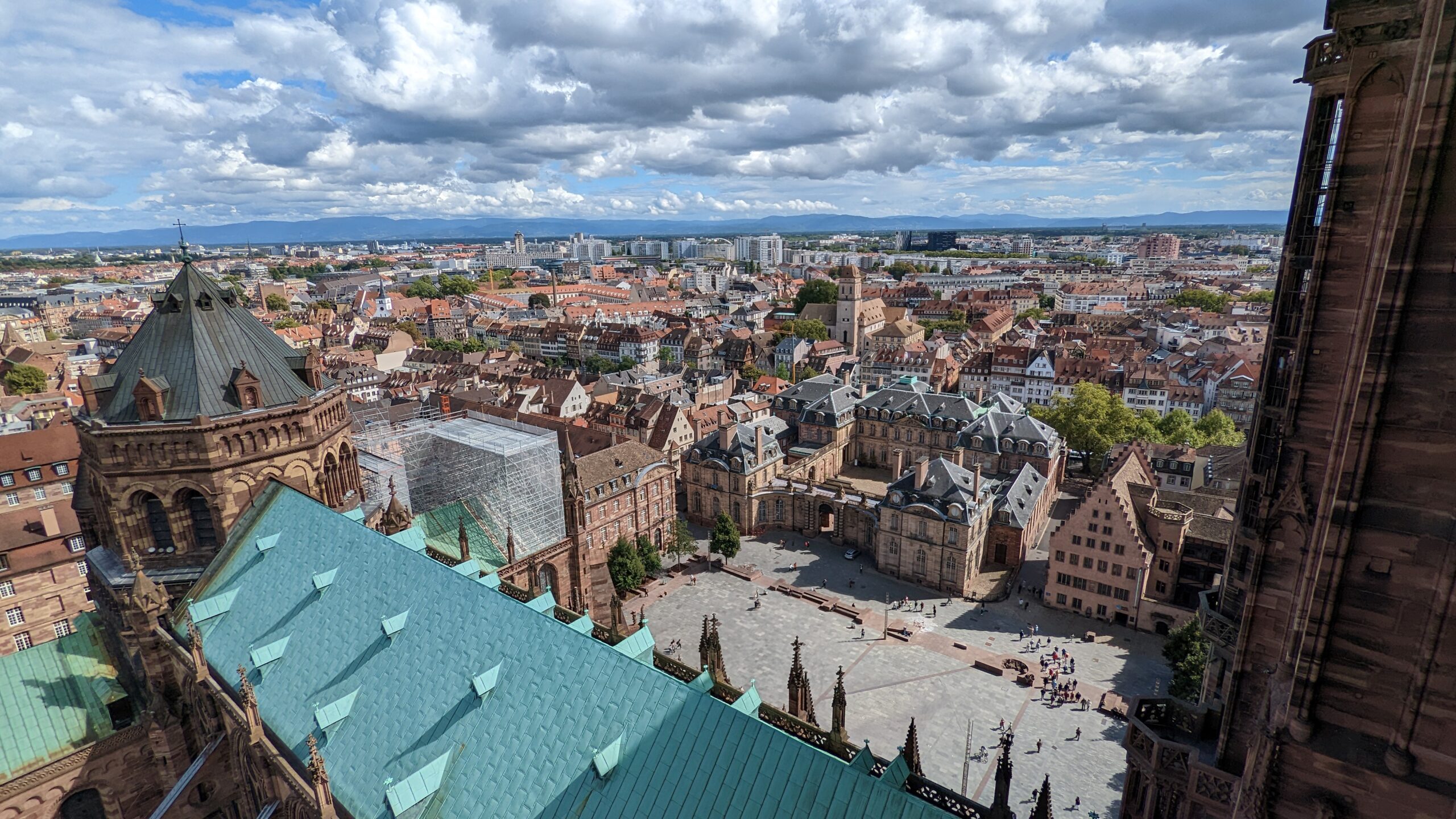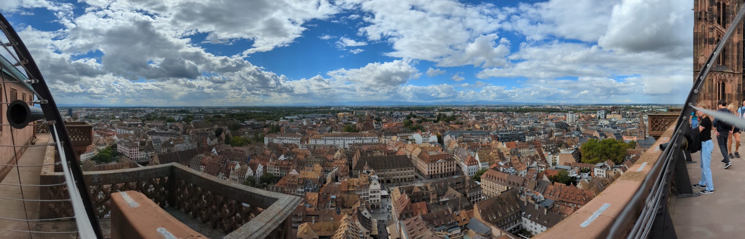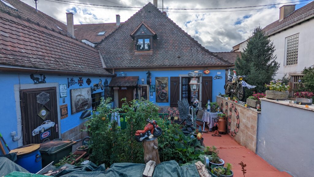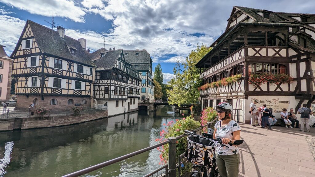 Die Tour führte uns weiter zum Musée d’Alsace, wo wir um 16 Uhr ankamen. Da es noch zwei Stunden geöffnet hatte, gingen wir hinein und bekamen sogar wieder Freikarten und einen Audioguide auf Deutsch. In drei Häusern wird das Leben und die Geschichte des Elsass gezeigt mit vielen Alltagsgegenständen, Gebräuchen und der alten ländlichen Bauweise. Während unseres Besuches zog ein Regenguss durch, der uns aber nichts ausmachte. Als wir das Museum verließen, war es wieder sonnig und trocken. Wir machten noch einen Abstecher zum Münster, dann beschlossen wir, zurück zum Camper zu radeln und uns Spaghetti zu kochen. Die Restaurants haben uns nicht wirklich zugesagt und es waren mal wieder zu viele Menschen unterwegs. Außerdem hatten wir noch guten Nachtisch im Kühlschrank. So verbrachten wir den Abend gemütlich in der Berta.