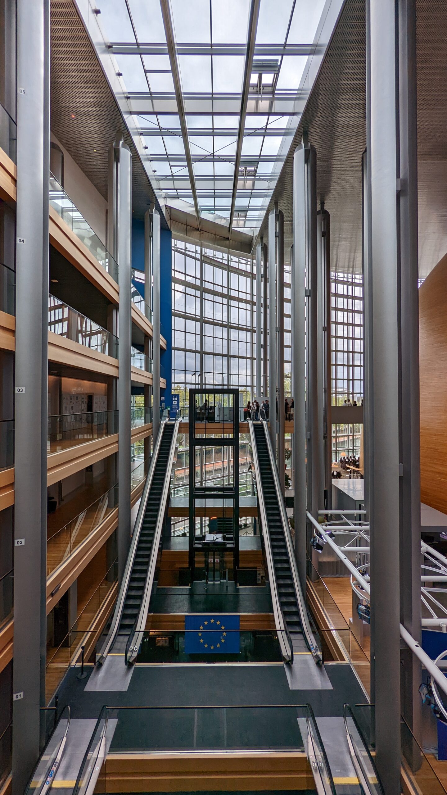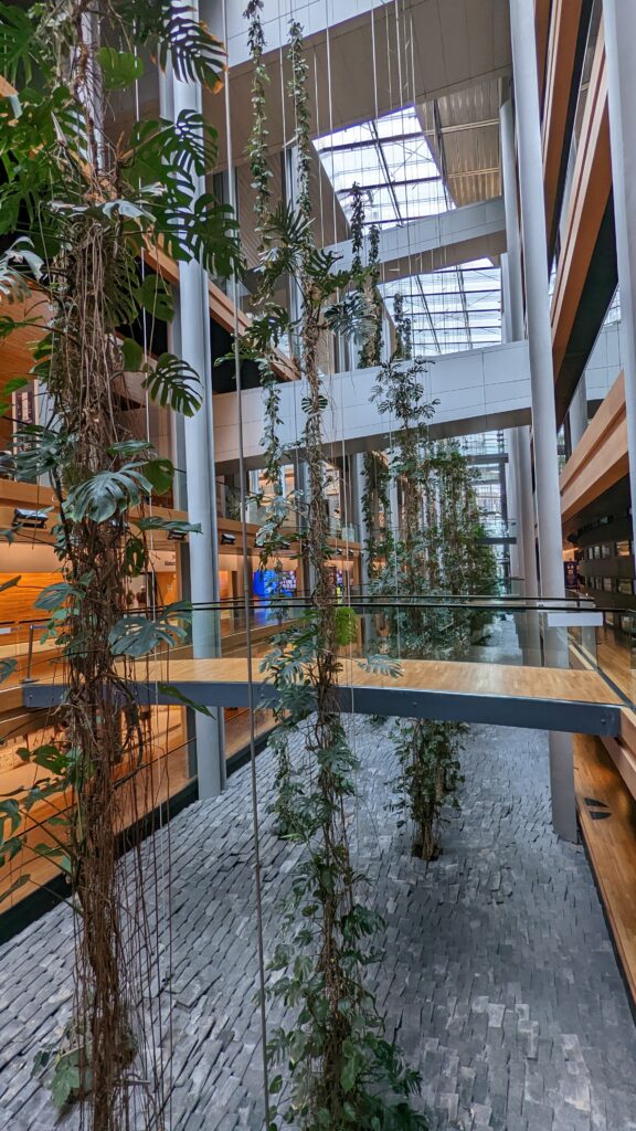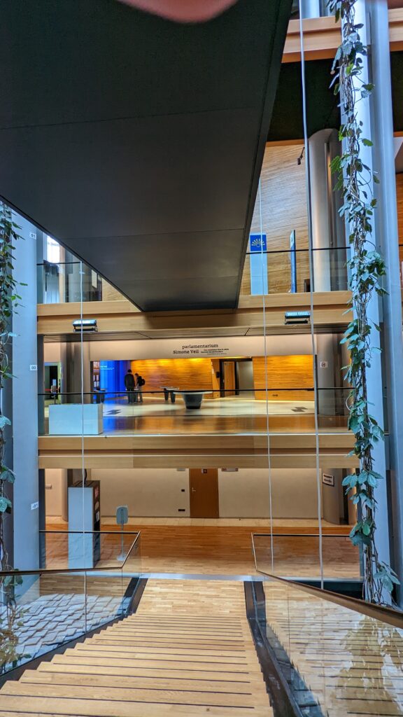 Dort gab es Sicherheitsvorkehrungen wie auf einem Flughafen – Personen- und Gepäckcheck. Dafür ist der Eintritt umsonst, man wird auf allerhand Tafeln über die Geschichte der EU informiert und kann den Plenarsaal auf der Besuchertribüne besichtigen. Es ist schon ein imposantes Gebäude mit einem Innenhof und Pflanzen und Rolltreppen über mehrere Stockwerke im Innern des Gebäudes.