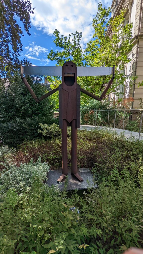 Um 12 Uhr verließen wir das Parlament und kauften an der Straßenbahnhaltestelle ein Tagesticket für 2-3 Personen um 6,90 Euro. Damit fuhren wir ins Zentrum, Haltestelle Republique. Dort befindet sich das Museum Tomi Ungerer in der Villa Greiner, an dem wir zufällig vorbeikamen und dem wir spontan einen Besuch abstatteten. Es ist ein Kunstmuseum mit einer große Sammlung von Zeichnungen, Archiven, Spielzeugen und Zeitschriften des elsässischen Künstlers Tomi Ungerer.
