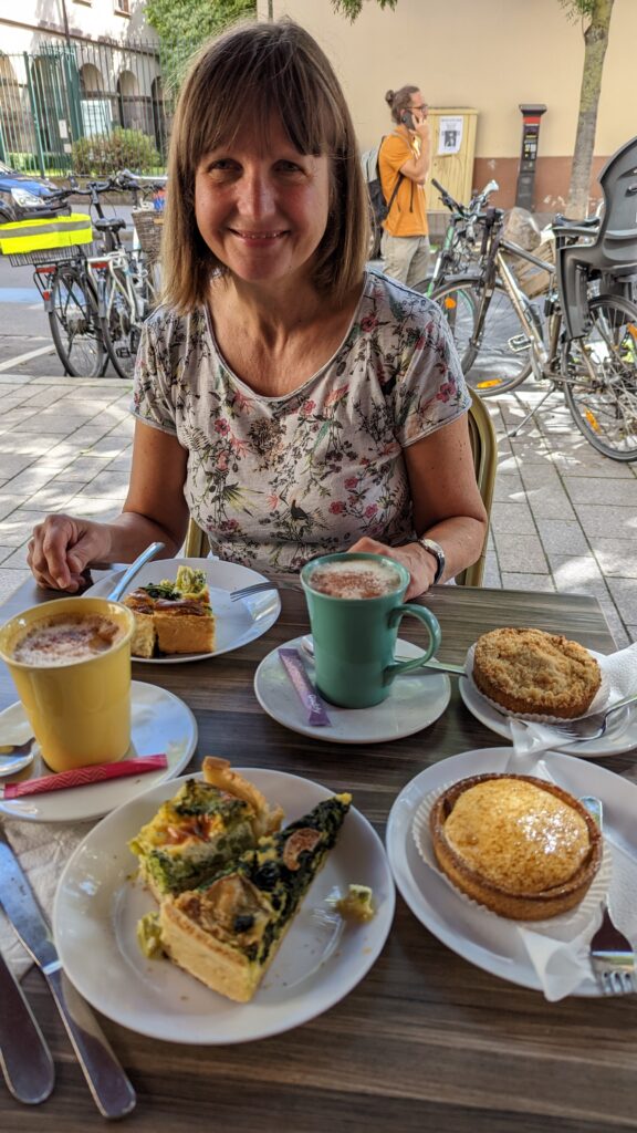 Weiter ging es zum Münster. Am Beginn der Innenstadt kauften wir uns bei einem Bäcker mit Café, das von Schülern und Einheimischen frequentiert wurde, zwei Stücke Gemüsequiche, zwei kleine süße Kuchen und für jeden einen Cappuccino.