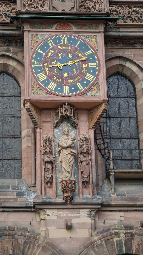 Wieder im Freien setzten wir uns gegenüber der astronomischen Uhr des Münsters auf eine Mauer und ruhten die Füße etwas aus. Auf dem Münsterplatz gab es noch ein Eis, dann machten wir uns so langsam auf den Rückweg. An der Ill entlang mit einer Rast auf einem Sonnenbänkle ging es über Petite France zur nächsten Straßenbahnhaltestelle.