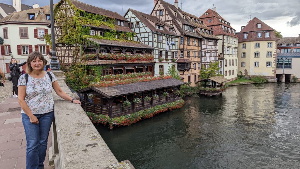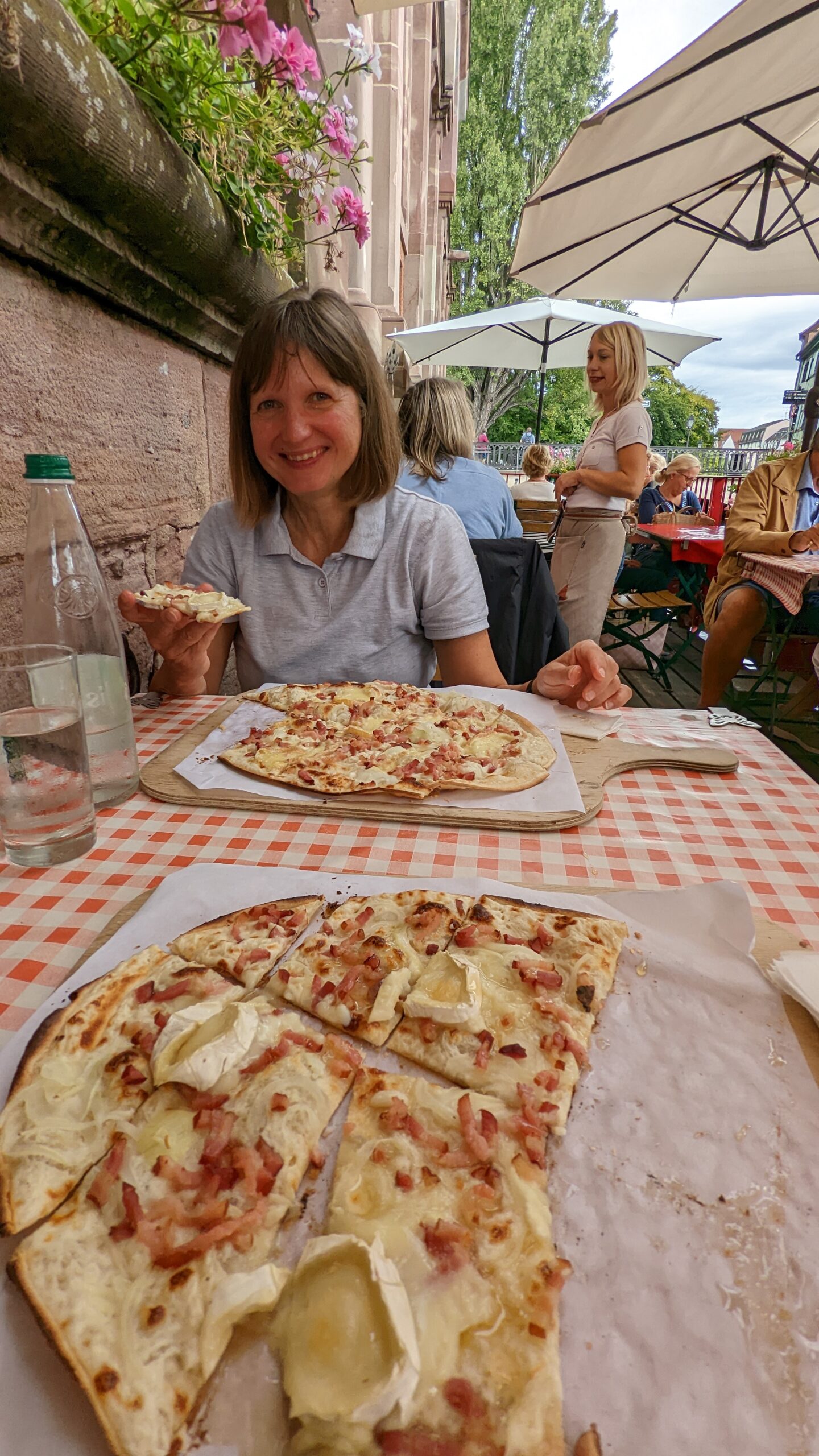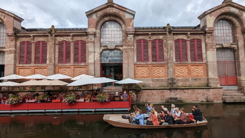 Anschließend machten wir uns auf den Weg zum Spielzeugmuseum, sahen aber dann doch von einem Besuch ab, da die Zeit schon sehr fortgeschritten war und das Parkticket kurz nach 13:30 auslief. So gingen wir lieber wieder durch die Altstadt zurück zu Petite Venice und dort in die Markthalle. Auf der Terrasse zum Kanal bekamen wir noch einen Platz an einem Tisch und verzehrten unseren letzten Flammkuchen im Elsass – Udo meinte, seiner mit Ziegenkäse und Honig sei der Beste gewesen, den er gegessen hat.
