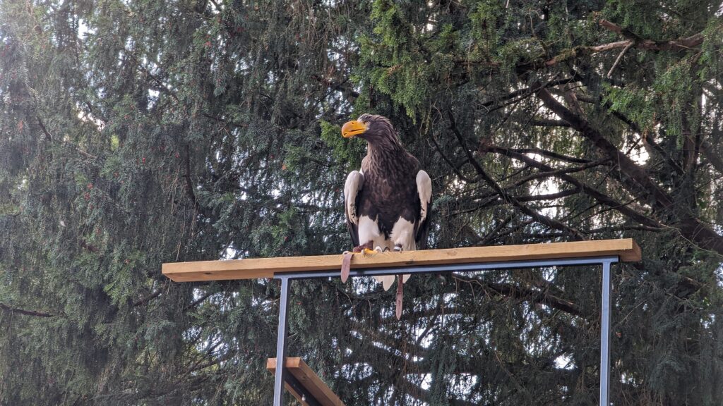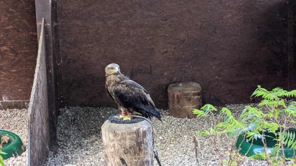 Weiter ging die Fahrt – diesmal auf Teerstraßen – zur Burg und zum Adlerhorst Kintzheim, wo heute ein besonderer Tag mit ermäßigtem Eintritt und mehreren Greifvögelvorführungen war. Als erstes kauften wir uns zwei Schnitzelbaguettes – sie nennen es Sandwiches – und verzehrten diese vor der Burg. Dann ging es ins Burggelände, wo wir im Hof eine 40-minütige recht beeindruckende Greifvögelvorführung sahen.