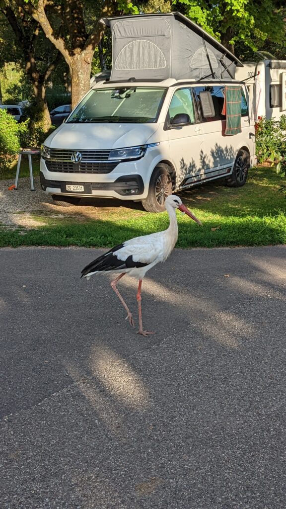Um 18 Uhr waren wir wieder an der Berta und freuten uns auf eine schöne Dusche. Auf dem Weg dorthin begegnete Xenia ein Storch auf dem Campingplatz.