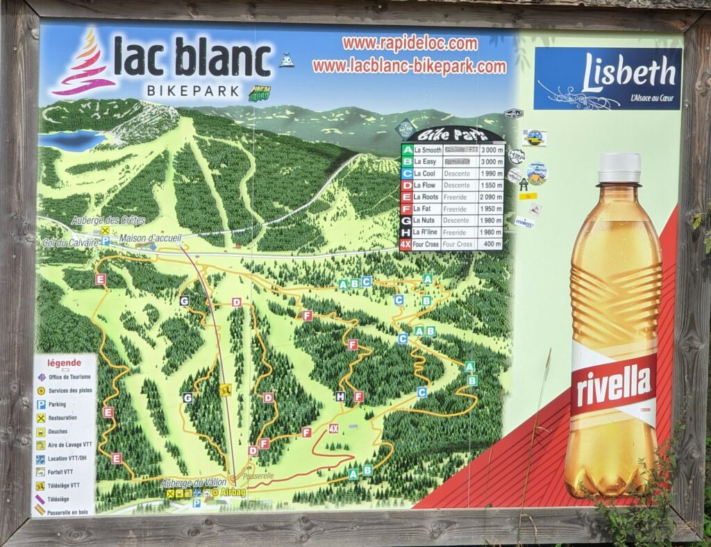 Um 13:30 Uhr kamen wir an einem schönen Platz, Col de Calvaire, in der Nähe des Lac Blanc auf 1134 m Höhe vorbei, wo wir eine Vesperpause einlegten. Wir parkten bei der Gipfelstation des Skilifts. Udo staunte nicht schlecht, als er entdeckte, dass es hier im Sommer fast so viele Downhill-Strecken für Mountainbikes gibt wie Skiabfahrten im Winter.