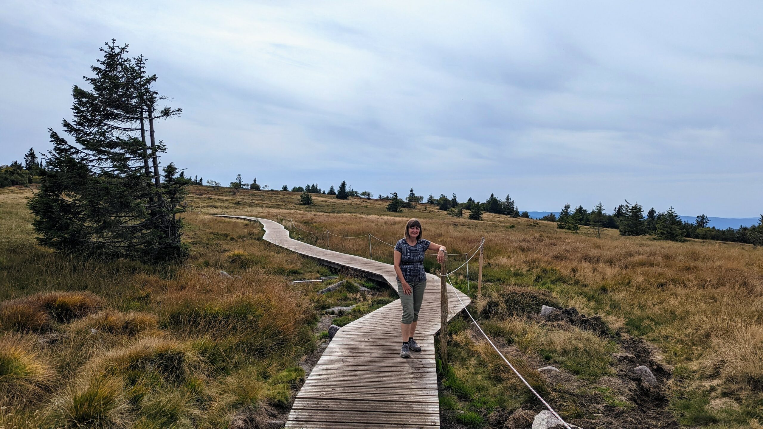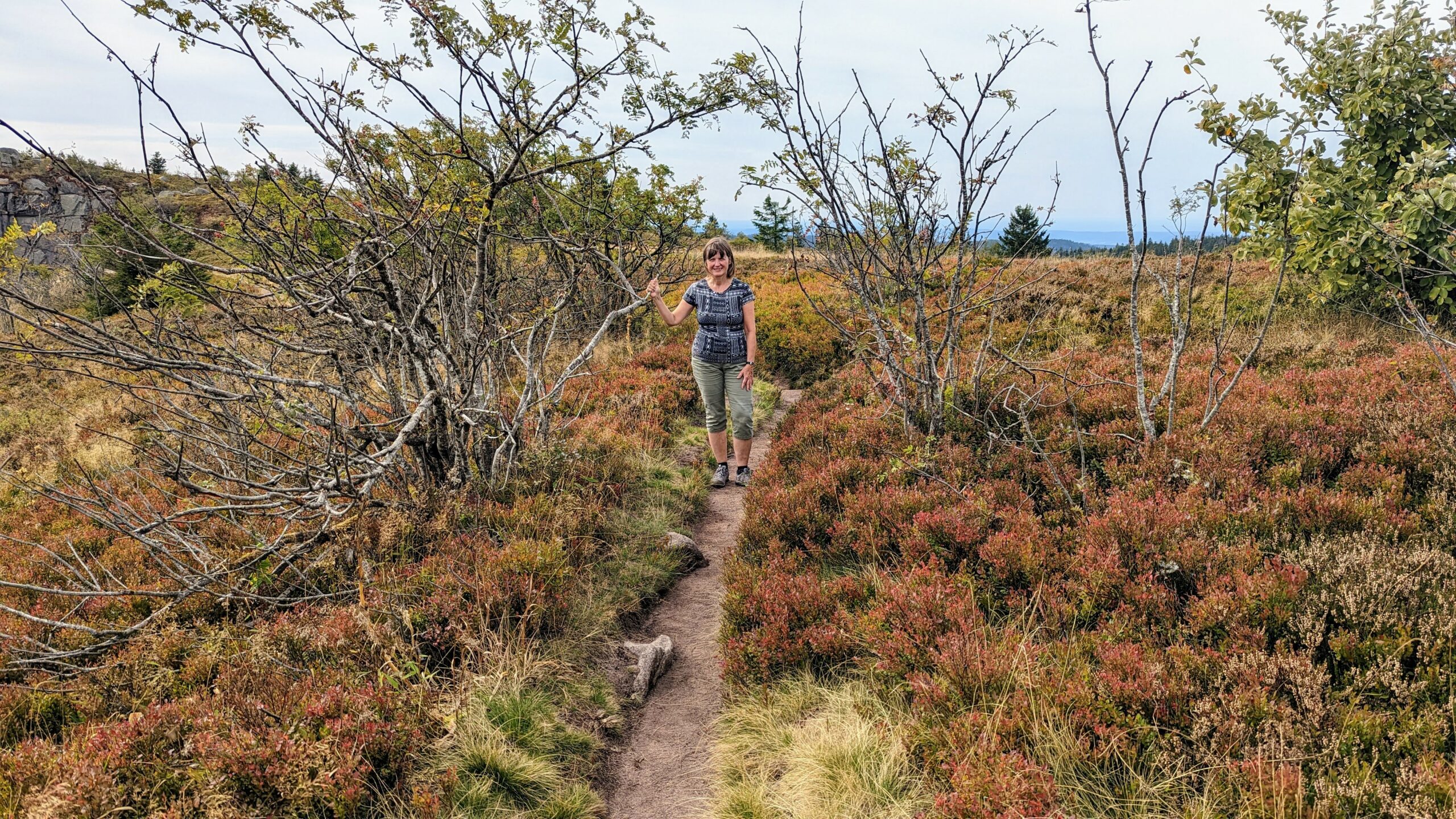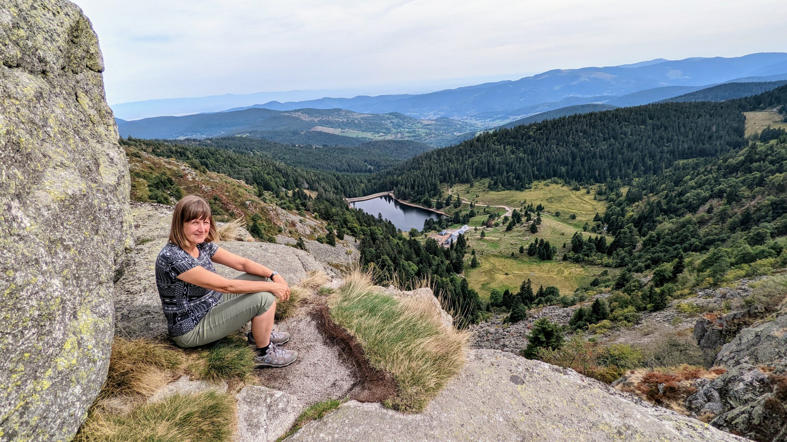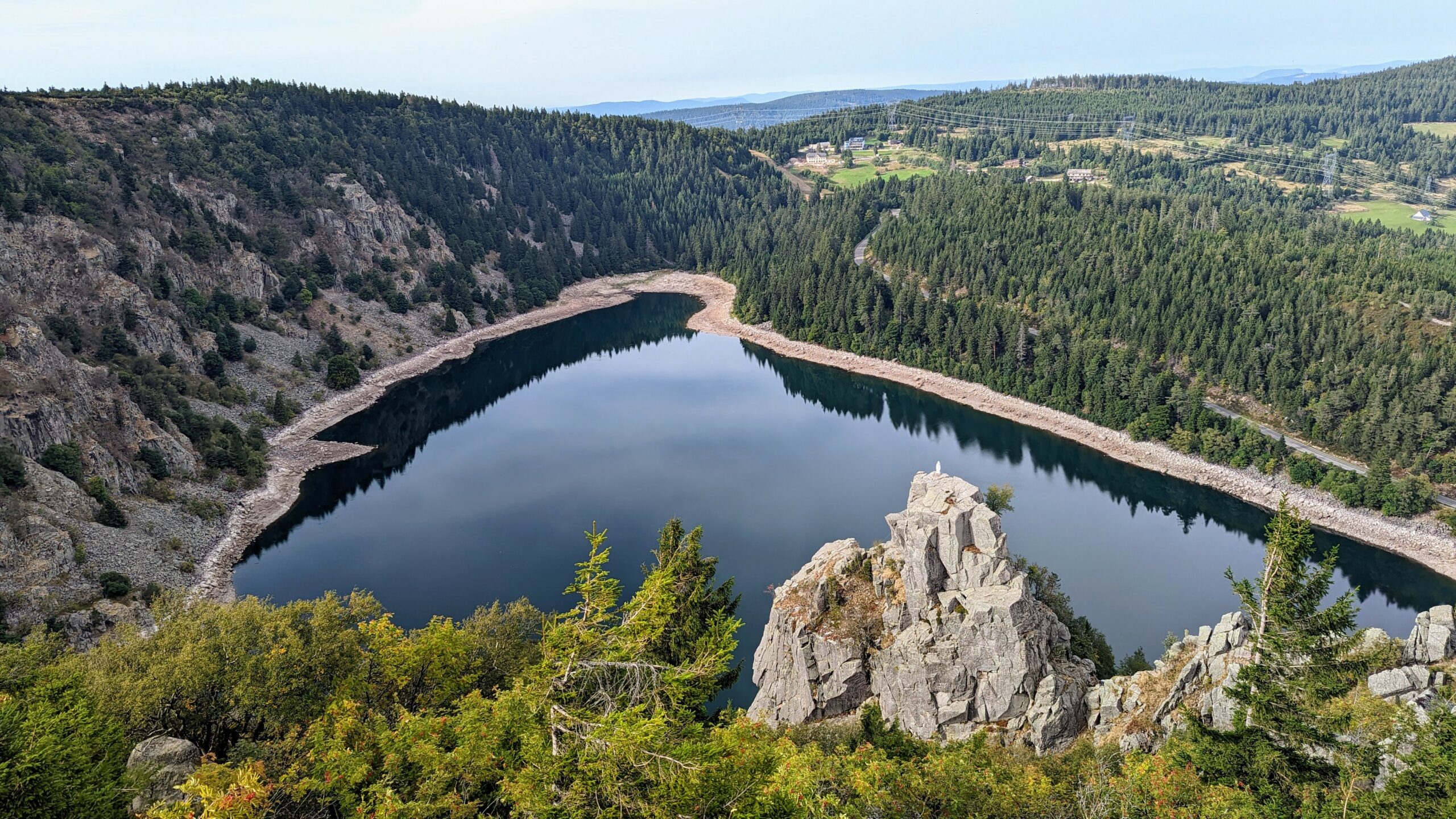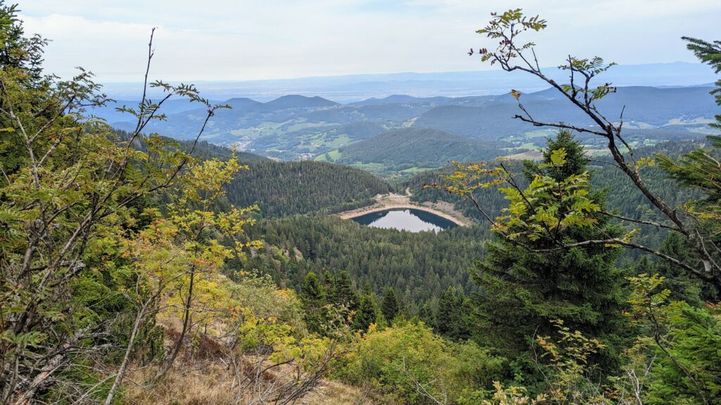 Auf Komoot entdeckte Udo eine wunderschöne Wanderung an einem Felskamm entlang, oberhalb von Lac Blanc und Lac Noir mit herrlichen Aussichten. Um 14:15 Uhr zogen wir los. Die Wege waren sehr schön, aber auch ziemlich anstrengend, da es zu 90% über Wurzeln und Steine ging. Das Wetter war ideal zum Wandern. Inzwischen war eine leichte Bewölkung aufgezogen, die uns vor der direkten Sonne schützte, aber es war trotzdem warm genug, um im T-Shirt und in kurzen Hosen unterwegs zu sein. Es ging teils durch den Wald, teils auf der Hochebene und auch an einem Abhang zum See entlang. Die Aussicht war immer wieder genial und wir genossen die herrliche Landschaft.