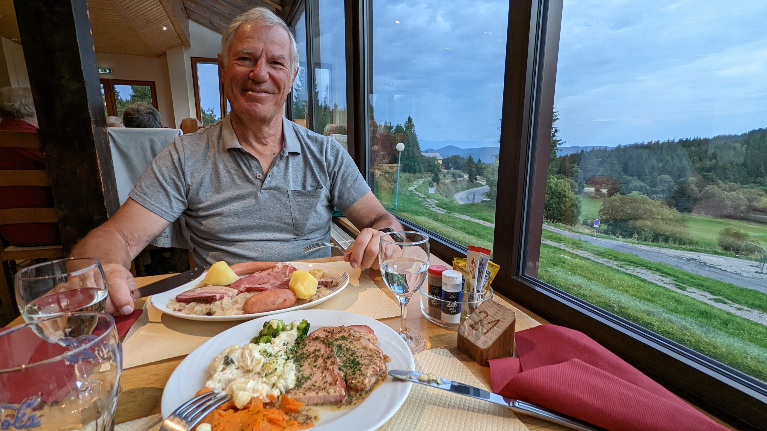 Um 17:45 Uhr waren wir wieder an der Berta und beschlossen, heute nicht mehr weiterzufahren. Auf dem Rückweg hatten wir ein paar Campingbusse an einem schönen Platz stehen gesehen. Zu diesen gesellten wir uns. Der Platz gehört zu einem Hotel und ist sogar mit Strom und Wasser ausgerüstet. Wer im Restaurant des Hotels eine Mahlzeit zu sich nimmt, ist zum Übernachten eingeladen. Das kam uns gerade recht. Wir duschten noch kurz und gingen dann ins schönes Restaurant, in dem allerdings schon eine Gruppe holländischer Senioren war. Daher war es ziemlich laut. Aber wir hatten einen schönen Fensterplatz und genossen elsässische Hausmannskost: Udo Sauerkraut mit 5 Fleischbeilagen, Xenia Kassler mit Kartoffelsalat.